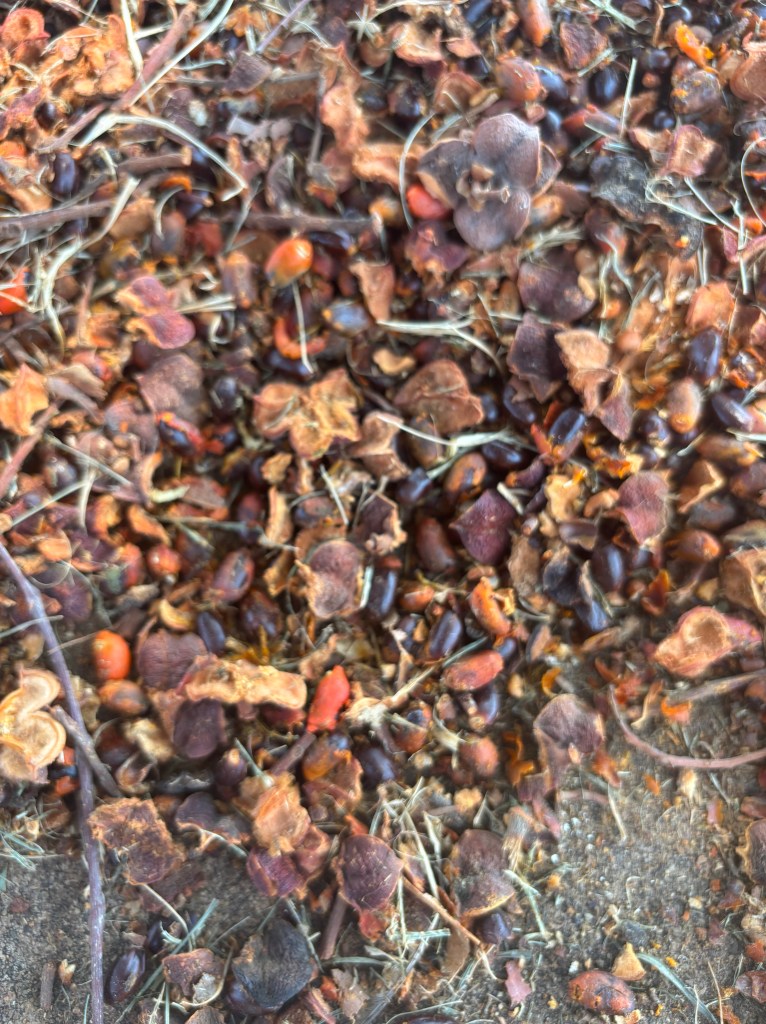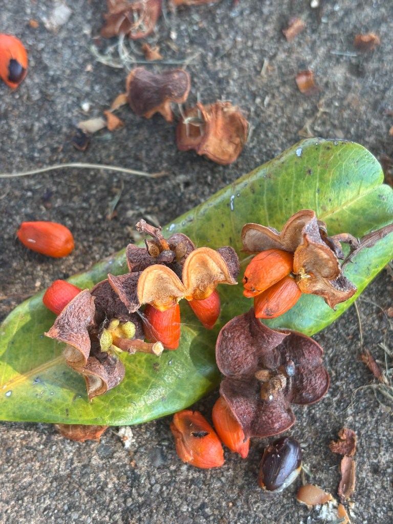 Upon seeing the seeds of this Australian tree (the carrotwood tree (Cupaniopsis anacardioides) here on American soil, I was suddenly visited by the image of the Colombian zapote: that fruit with fiery orange tones, fibrous and fleshy, shaped like a maraca with its round form and persistent stem, as if still clinging to the tree.